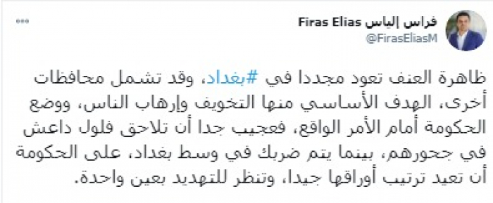 وقال في تغريدة على حسابه بموقع التدوين المصغر تويتر، اليوم إن: "ظاهرة العنف تعود مجددًا في بغداد، وقد تشمل محافظات أخرى".