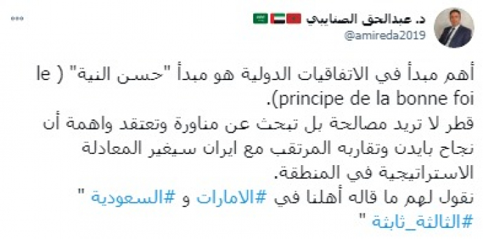 وشدد في تغريدة على حسابه بموقع التدوين المصغر تويتر، اليوم على أن: "أهم مبدأ في الاتفاقيات الدولية هو مبدأ "حسن النية" (le principe de la bonne foi)".