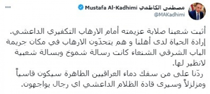 قال رئيس الوزراء العراقي مصطفى الكاظمي إن شعب العراق برهن على صلابة عزيمته أمام الإرهاب الداعشي، متعهدا برد قاس على من سفك دماء الأبرياء.