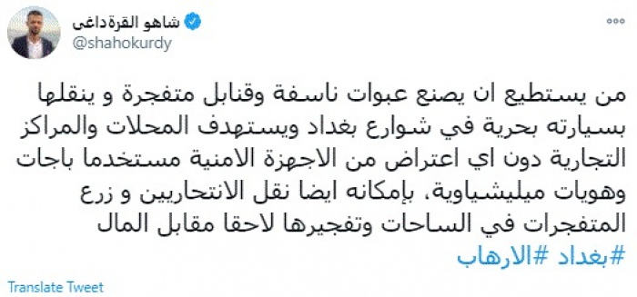 وقال في تغريدة عبر "تويتر" رصدها "المشهد العربي": "من يستطيع أن يصنع عبوات ناسفة وقنابل متفجرة وينقلها بسيارته بحرية في شوارع بغداد ويستهدف المحلات والمراكز التجارية دون أي اعتراض من الأجهزة الأمنية مستخدما باجات وهويات مليشياوية، بإمكانه أيضًا نقل الانتحاريين وزرع المتفجرات في الساحات وتفجيرها لاحقا مقابل المال".