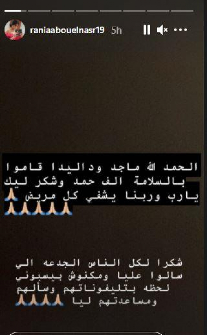 وعبر خاصية القصص القصيرة كتبت "رانيا": "الحمد لله، ماجد وداليدا قاموا بالسلامة، ألف حمد وشكر ليك يا رب، وربنا يشفى كل مريض"، شكرا لكل الناس الجدعة اللي سألوا عليا ومكنوش بيسبوني لحظة بتليفوناتهم ومساعدتهم ليا".