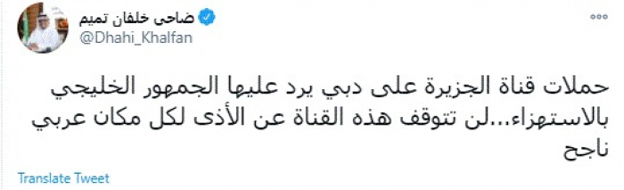 وقال في تغريدة عبر "تويتر" رصدها "المشهد العربي": "حملات قناة الجزيرة على دبي يرد عليها الجمهور الخليجي بالاستهزاء... لن تتوقف هذه القناة عن الأذى لكل مكان عربي ناجح".