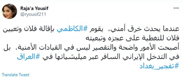 وقالت في تغريدة عبر "تويتر" رصدها "المشهد العربي": "عندما يحدث خرق أمني، يقوم الكاظمي بإقالة فلان وتعيين فلان للتغطية على عجزه وتبعيته أصبحت الأمور واضحة والتقصير ليس في القيادات الأمنية، بل في التدخل الإيراني السافر عبر مليشياتها في العراق".