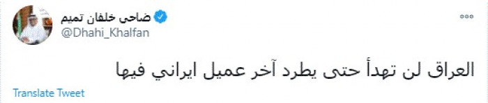 وكتب في تغريدة عبر "تويتر" رصدها "المشهد العربي": "العراق لن يهدأ حتى يطرد آخر عميل إيراني فيها".