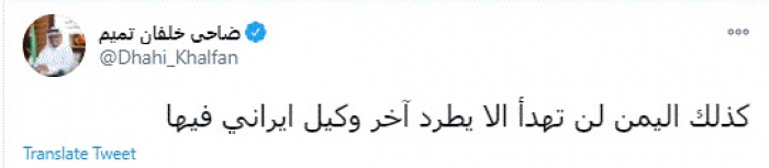 وأضاف في تغريدة أخرى: "كذلك اليمن لن يهدأ الا يطرد آخر وكيل إيراني فيها".