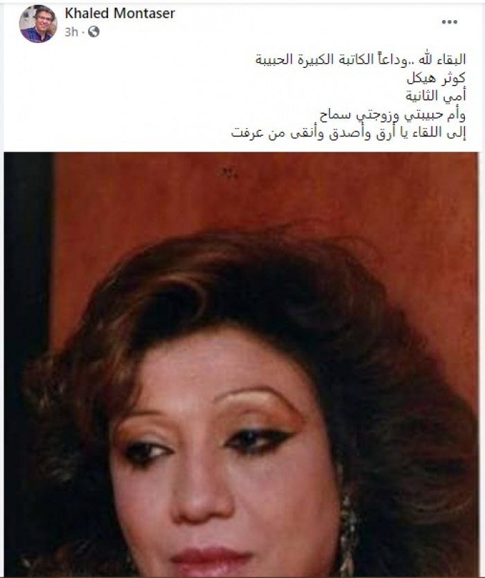 ونشر منتصر صورة لكوثر، معلقا "البقاء لله.. وداعاً الكاتبة الكبيرة الحبيبة كوثر هيكل، أمي الثانية، وأم حبيبتي وزوجتي سماح".