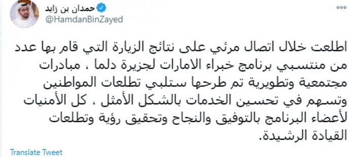 وقال في تغريدة عبر "تويتر" رصدها "المشهد العربي": "إطلعت خلال اتصال مرئي على نتائج الزيارة التي قام بها عدد من منتسبي برنامج خبراء الامارات لجزيرة دلما ، مبادرات مجتمعية وتطويرية تم طرحها ستلبي تطلعات المواطنين وتسهم في تحسين الخدمات بالشكل الأمثل، كل الأمنيات لأعضاء البرنامج بالتوفيق والنجاح وتحقيق رؤية وتطلعات القيادة الرشيدة".