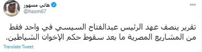 وقال في تغريدة عبر "تويتر" رصدها "المشهد العربي": "تقرير ينصف عهد الرئيس عبدالفتاح السيسي في واحد فقط من المشاريع المصرية ما بعد سقوط حكم الإخوان الشياطين".