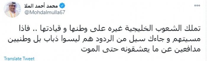 وقال في تغريدة عبر "تويتر" رصدها "المشهد العربي": "تملك الشعوب الخليجية غيره على وطنها و قيادتها .. فاذا مسيتهم و جاءك سيل من الردود هم ليسوا ذباب بل وطنيين مدافعين عن ما يعشقونه حتى الموت".