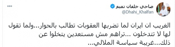 وقال في تغريدة عبر "تويتر" رصدها "المشهد العربي": "الغريب أن إيران لما تضربها العقوبات تطالب بالحوار...ولما تقول لها لا تتدخلون ...تراهم مش مستعدين يتخلوا عن ذلك...غريبة سياسة الملالي".