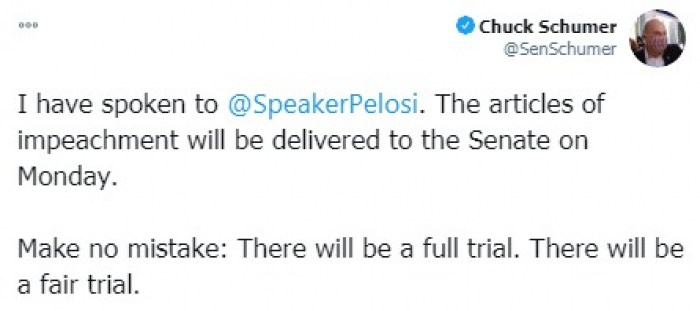وقال في تغريدة على حسابه بموقع التدوين المصغر تويتر، اليوم إني: "تحدث مع نانسي بيلوسي، سيتم تسليم مواد الاتهام إلى مجلس الشيوخ يوم الاثنين".