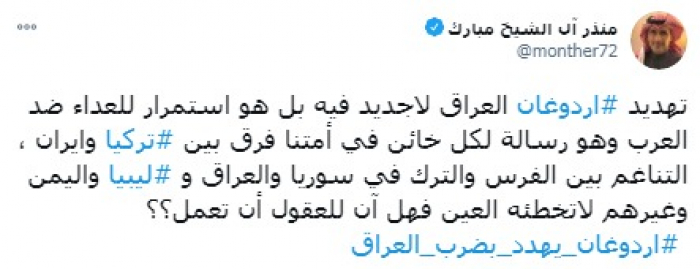 أكد المدون السعودي منذر آل الشيخ، أن تهديدات الرئيس التركي رجب طيب أردوغان بضرب العراق تعد استمرارا لعدائه للعرب.