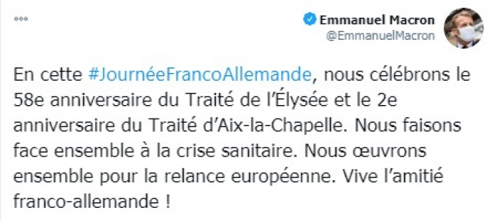 وقال في تغريدة على حسابه بموقع التدوين المصغر تويتر، اليوم إننا: "في هذا اليوم، نحتفل بالذكرى الثامنة والخمسين لمعاهدة الإليزيه والذكرى الثانية لمعاهدة إيكس لا شابيل".