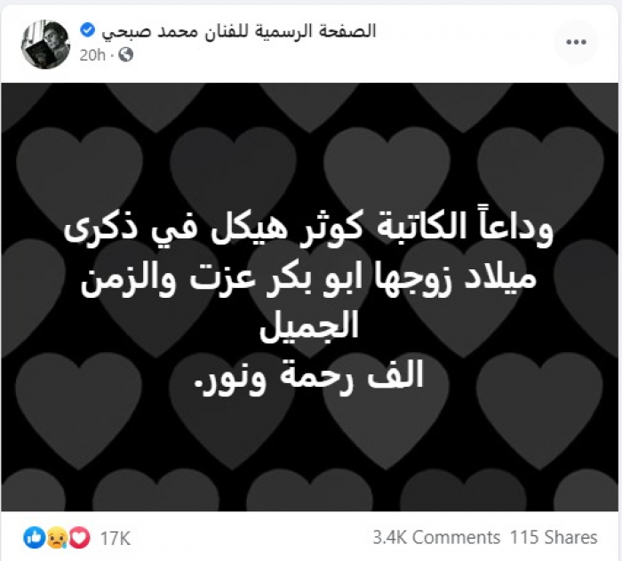 نعى الفنان محمد صبحي، الكاتبة المصرية كوثر هيكل، أرملة الفنان الراحل أبو بكر عزت.