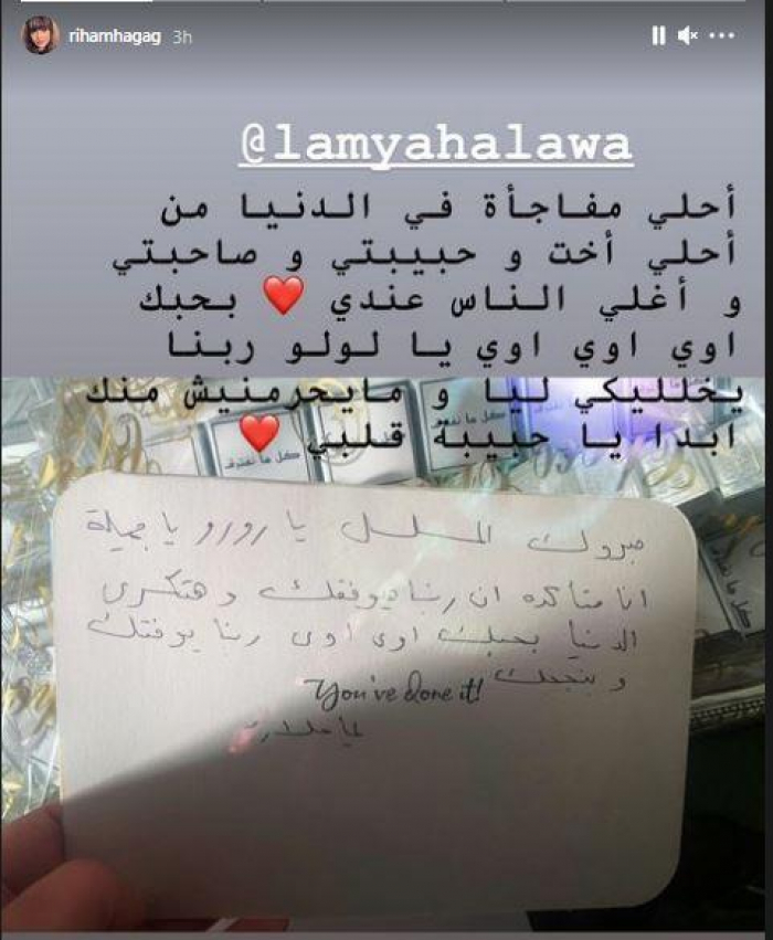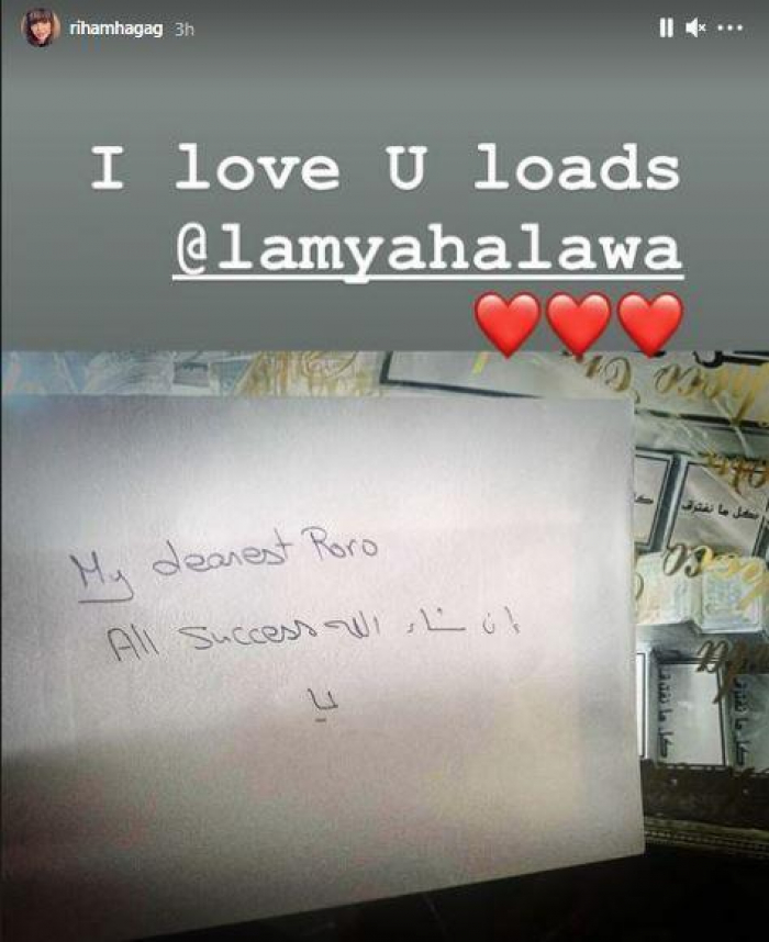 وكانت "لمياء" شقيقة زوج ريهام حجاج، كتبت على الهدية: "مبروك المسلسل يا رورو يا جميلة ..أنا متأكدة إن ربنا هيوفقك وهتكسري الدنيا .. بحبك أوي أوي ..ربنا يوفقك وينجحك".