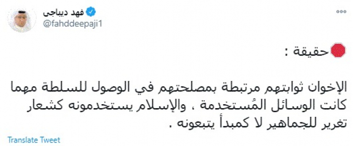 وكتب في تغريدة عبر "تويتر" رصدها "المشهد العربي": "الإخوان ثوابتهم مرتبطة بمصلحتهم في الوصول للسلطة مهما كانت الوسائل المُستخدمة، والإسلام يستخدمونه كشعار تغرير للجماهير لا كمبدأ يتبعونه".