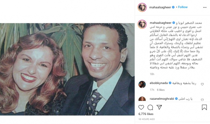 ونشرت مها، صورة تجمع والدها بوالدتها، عبر حسابها على إنستجرام، وعلقت: "محمد الصغير.. أبويا وحب عمري، حبيبي ونور عيني وحرمه أمي أجمل وأقوى وأطيب قلب".
