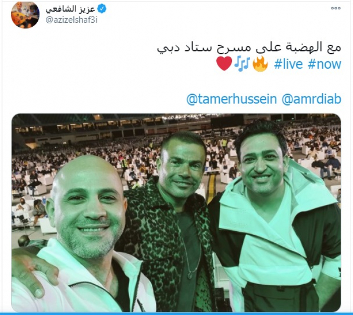 ونشر الشافعي، صورة من كواليس الحفل، عبر حسابه على تويتر، وعلق: "مع الهضبة على مسرح ستاد دبي".