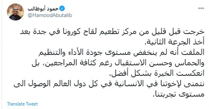 وقال في تغريدة عبر "تويتر" رصدها "المشهد العربي": "خرجت قبل قليل من مركز تطعيم لقاح كورونا في جدة بعد أخذ الجرعة الثانية. الملفت أنه لم ينخفض مستوى جودة الأداء والتنظيم والحماس وحسن الاستقبال رغم كثافة المراجعين، بل انعكست الخبرة بشكل أفضل. نتمنى لإخوتنا في الانسانية في كل دول العالم الوصول إلى مستوى تجربتنا".