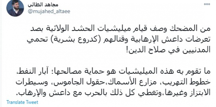وكتب في تغريدة عبر "تويتر" رصدها "المشهد العربي": "من المضحك وصف قيام ميليشيات الحشد الولائية بصد تعرضات داعش الإرهابية وقتالهم (كدروع بشرية) تحمي المدنيين في صلاح الدين! ما تقوم به هذه الميليشيات هو حماية مصالحها؛ آبار النفط، خطوط التهريب، مزارع الأسماك،حقول الجاموس، وسيطرات الابتزاز وغيرها، وتغطي كل ذلك بالحرب مع داعش والإرهاب".