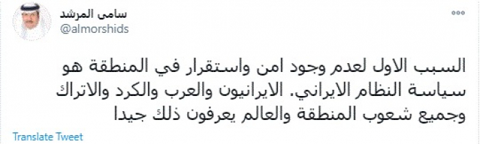وكتب في تغريدة عبر "تويتر" رصدها "المشهد العربي": "السبب الأول لعدم وجود أمن واستقرار في المنطقة هو سياسة النظام الإيراني".