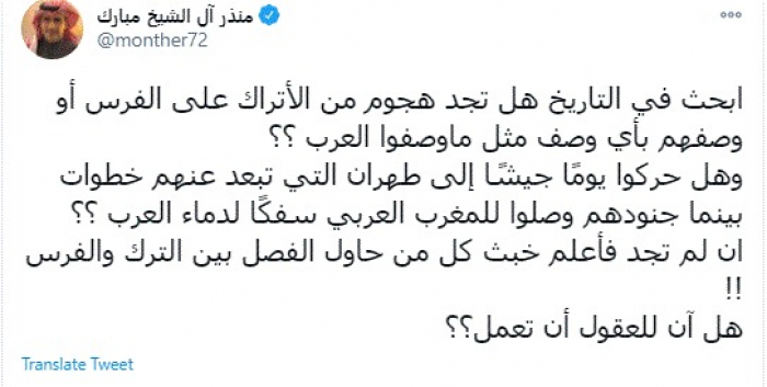 وقال في تغريدة عبر "تويتر" رصدها "المشهد العربي": "ابحث في التاريخ هل تجد هجوم من الأتراك على الفرس أو وصفهم بأي وصف مثل ما وصفوا العرب؟".