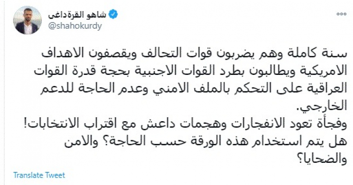 طرح الكاتب الصحفي العراقي شاهو القرةداغي، اليوم، عدة تساؤلات حول ظهور هجمات داعش في العراق بالتزامن مع اقتراب الانتخابات في البلاد.