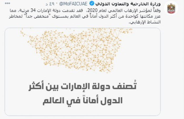 وأكدت في تغريدة أنه: "وفقا لمؤشر الإرهاب العالمي لعام 2020، فقد تقدمت دولة الإمارات 34 مرتبة، مما عزز مكانتها كواحدة من أكثر الدول أمانا في العالم بمستوى "منخفض جدا" لمخاطر النشاط الإرهابي".