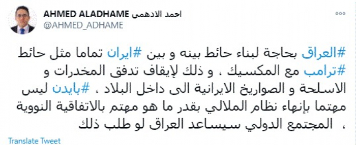وقال في تغريدة عبر "تويتر" رصدها "المشهد العربي": "العراق بحاجة لبناء حائط بينه وبين إيران تماما مثل حائط ترامب مع المكسيك، وذلك لإيقاف تدفق المخدرات والأسلحة والصواريخ الإيرانية إلى داخل البلاد".