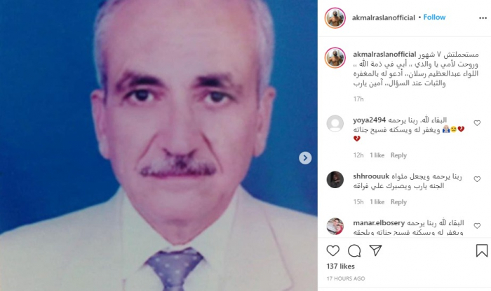 ونشر رسلان صورتين لوالده، الأولى من مرحلة شبابه والثانية بعد تقدمه في العمر، معلقا "مستحملتش ٧ شهور وروحت لأمي يا والدي، أبي في ذمة الله، اللواء عبدالعظيم رسلان، ادعو له بالمغفرة والثبات عند السؤال، آمين يا رب".