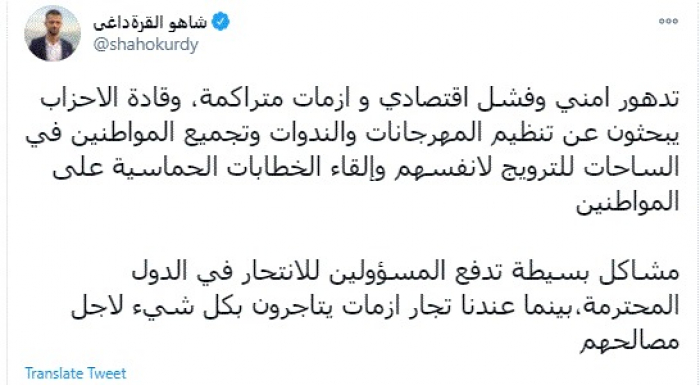 شن الكاتب الصحفي العراقي شاهو القرةداغي، اليوم، هجومًا حادًا على قادة الأحزاب السياسية الموالية لإيران في العراق، جراء تركيزهم على الاستعداد للانتخابات العراقي بتنظيم الندوات والتجمعات دون الاهتمام بأزمات المواطنين.