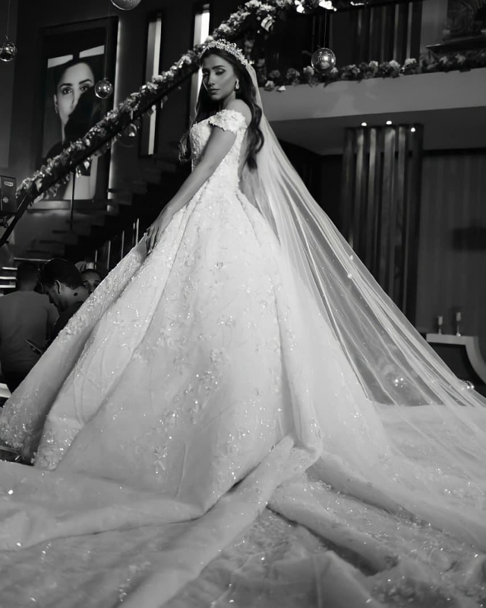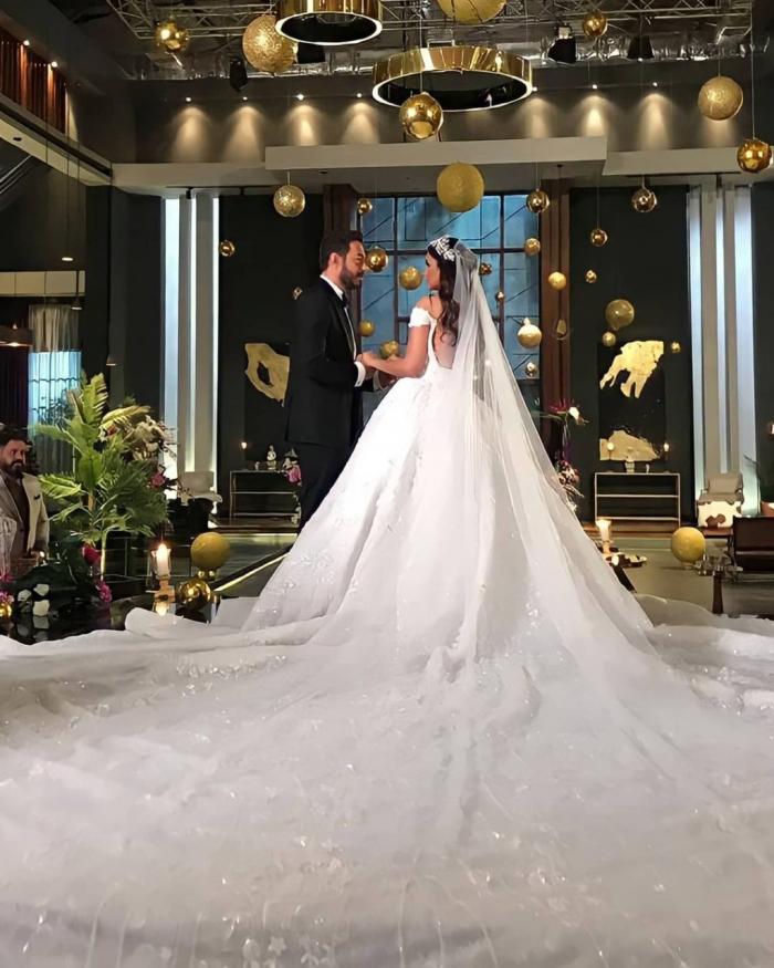 وظهرت مي عمر بفستان زفاف أنيق من كواليس زواجها الثاني بالفنان أحمد زاهر، خلال أحداث مسلسل "لؤلؤ".