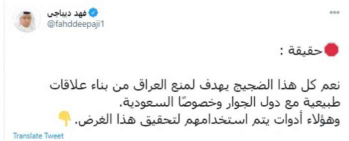 وكتب في تغريدة عبر "تويتر" رصدها "المشهد العربي": "حقيقة: نعم كل هذا الضجيج يهدف لمنع العراق من بناء علاقات طبيعية مع دول الجوار وخصوصًا السعودية. وهؤلاء أدوات يتم استخدامهم لتحقيق هذا الغرض".