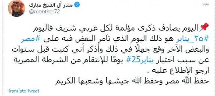 وكتب في تغريدة عبر "تويتر" رصدها "المشهد العربي": "اليوم يصادف ذكرى مؤلمة لكل عربي شريف فاليوم ٢٥ يناير هو ذلك اليوم الذي تآمر البعض فيه على مصر والبعض الآخر وقع جهلًا في ذلك".