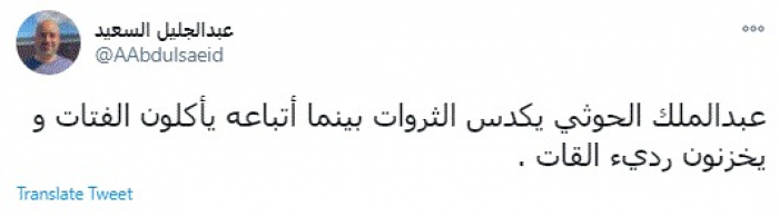 وقال في تغريدة عبر "تويتر" رصدها "المشهد العربي": "عبدالملك الحوثي يكدس الثروات بينما أتباعه يأكلون الفتات ويخزنون رديء القات".