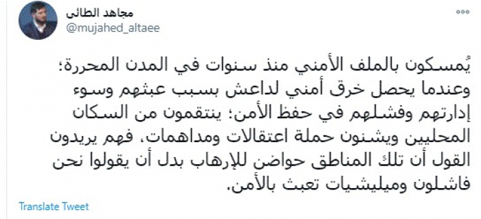 وقال في تغريدة عبر "تويتر" رصدها "المشهد العربي": "يُمسكون بالملف الأمني منذ سنوات في المدن المحررة؛ وعندما يحصل خرق أمني لداعش بسبب عبثهم وسوء إدارتهم وفشلهم في حفظ الأمن".