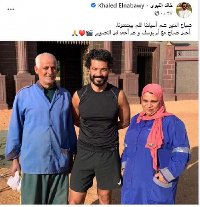 خالد نشر الصورة عبر صفحته في موقع فيسبوك، وكتب "صباح الخير على أسيادنا اللي بيخدمونا، احلى صباح مع أم يوسف وعم أحمد فى التصوير ".