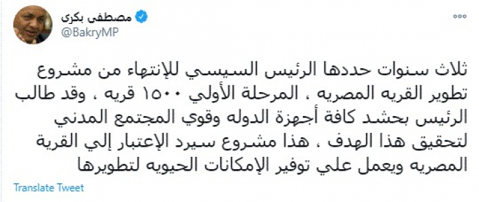 وكتب في تغريدة عبر "تويتر" رصدها "المشهد العربي": "ثلاث سنوات حددها الرئيس السيسي للانتهاء من مشروع تطوير القرية المصرية، المرحلة الأولي ١٥٠٠ قرية، وقد طالب الرئيس بحشد كافة أجهزة الدولة وقوى المجتمع المدني لتحقيق هذا الهدف".
