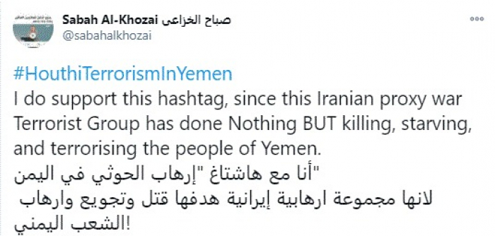 وقال في تغريدة عبر "تويتر" رصدها "المشهد العربي": "أنا مع هاشتاغ إرهاب الحوثي في اليمن لأنها مجموعة إرهابية إيرانية هدفها قتل وتجويع وإرهاب الشعب اليمني".