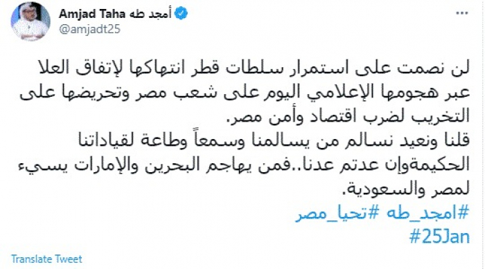 وكتب في تغريدة عبر "تويتر" رصدها "المشهد العربي": "لن نصمت على استمرار سلطات قطر انتهاكها لاتفاق العلا عبر هجومها الإعلامي اليوم على شعب مصر وتحريضها على التخريب لضرب اقتصاد وأمن مصر".