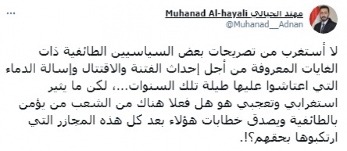 وأوضح في تغريدة على حسابه بموقع التدوين المصغر تويتر، اليوم أنه: "لا استغرب من تصريحات بعض السياسيين الطائفية ذات الغايات المعروفة من أجل إحداث الفتنة والاقتتال وإسالة الدماء التي اعتاشوا عليها طيلة تلك السنوات".