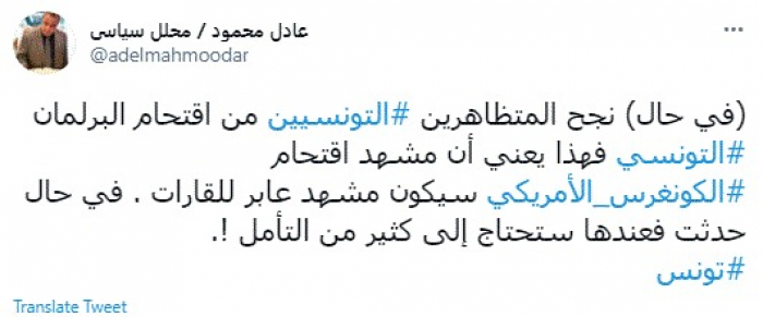 وقال في تغريدة عبر "تويتر" رصدها "المشهد العربي": "(في حال) نجح المتظاهرين لتونسيين من اقتحام البرلمان التونسي فهذا يعني أن مشهد اقتحام الكونغرس الأمريكي سيكون مشهد عابر للقارات. في حال حدثت فعندها ستحتاج إلى كثير من التأمل".