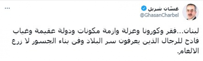 وقال في تغريدة على حسابه بموقع التدوين المصغر تويتر، اليوم: "لبنان...فقر وكورونا وعزلة وأزمة مكونات ودولة عقيمة وغياب فادح للرجال الذين يعرفون سر البلاد وفن بناء الجسور لا زرع الألغام".