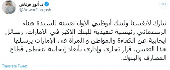 وقال في تغريدة عبر "تويتر" رصدها "المشهد العربي": "نبارك لأنفسنا ولبنك أبوظبي الأول تعيينه للسيدة هناء الرستماني رئيسية تنفيذية للبنك الاكبر في الإمارات، رسائل إيجابية عن الكفاءة والمواطن والمرأة في الإمارات يرسلها هذا التعيين، قرار تجاري وإداري بأبعاد إيجابية تتخطى قطاع المصارف والبنوك".