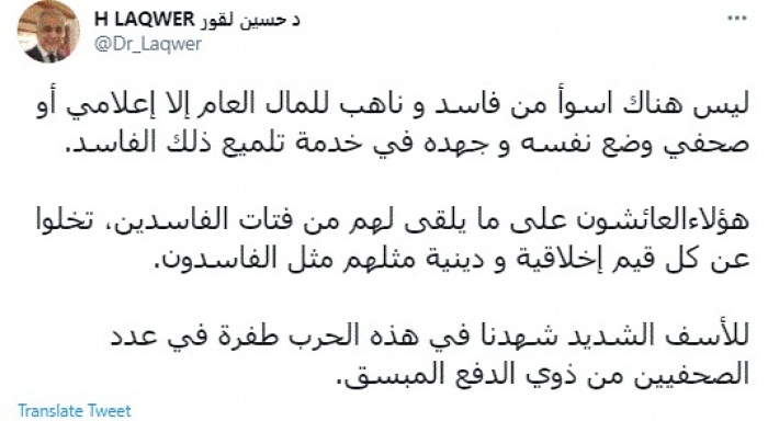 وقال في تغريدة عبر "تويتر" رصدها "المشهد العربي": "ليس هناك أسوأ من فاسد وناهب للمال العام إلا إعلامي أو صحفي وضع نفسه وجهده في خدمة تلميع ذلك الفاسد".