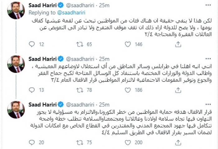 وتابع: "إنني انبه أهلنا في طرابلس وسائر المناطق من أي استغلال لاوضاعهم المعيشية ، واطالب الدولة والوزارات المختصة باستنفاد كل الوسائل المتاحة لكبح جماح الفقر والجوع وتوفير المقومات الاجتماعية لالتزام المواطنين قرار الإقفال العام".