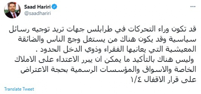 وقال في سلسلة تغريدات عبر "تويتر" رصدها "المشهد العربي": "قد تكون وراء التحركات في طرابلس جهات تريد توجيه رسائل سياسية وقد يكون هناك من يستغل وجع الناس والضائقة المعيشية التي يعانيها الفقراء وذوي الدخل الحدود".