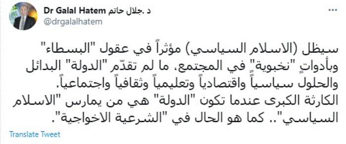 حاتم: ممارسة الدولة للإسلام السياسي كارثة كبرى