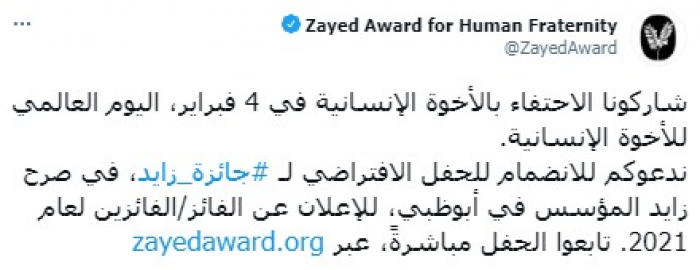 أعلنت جائزة زايد الدولية للأخوة الإنسانية تنظيم حفل افتراضي للجائزة 4 فبراير المقبل.