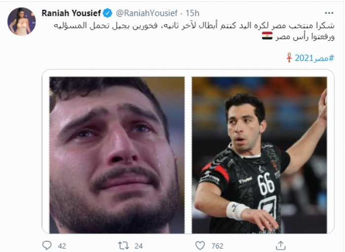 وكتبت رانيا، عبر حسابها على تويتر: "شكرًا منتخب مصر لكرة اليد.. كنتم أبطال لآخر ثانية.. فخورين بجيل تحمل المسؤلية ورفعتوا رأس مصر".